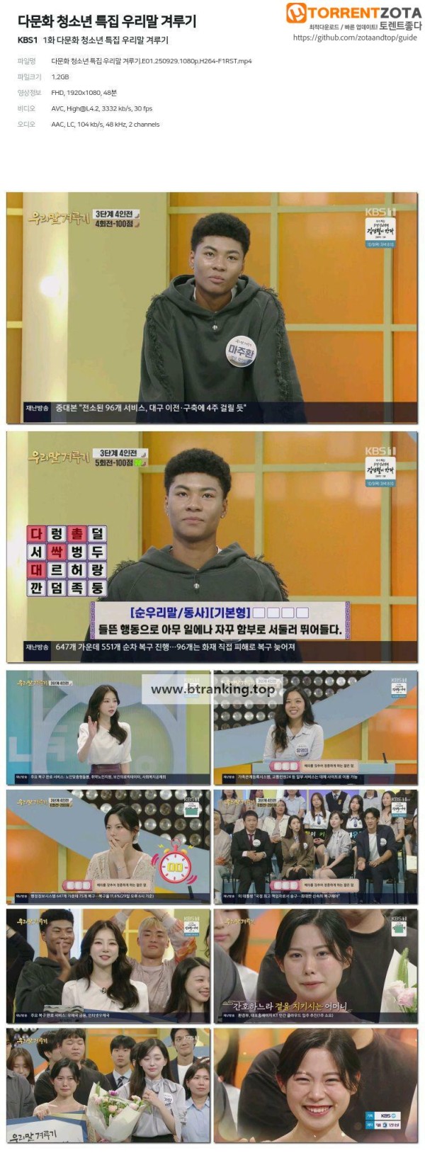 다문화 청소년 특집 우리말 겨루기.E01.250929.1080p-F1RST 작성자 정보 admin 작성 작성일 2025.09.29 20:35 컨텐츠 정보 55 조회 목록 관련 링크 magnet:?xt=urn:btih:5dada4594887ffcf801f3985d66d8073e33e9967 27 회 연결 첨부파일 다문화 청소년 특집 우리말 겨루기.E01.250929.1080p-F1RST.torrent 파일크기 토렌트 다운로드 1 회 다운로드 등록일 2025.09.29 20:35 본문 다문화 청소년 특집 우리말 겨루기.E01.250929.1080p-F1RST 관련자료 이전 절친 토큐멘터리 4인용식탁.E107.250929.1080p-F1RST 작성일 2025.09.29 21:35 다음 2TV 생생정보.E2386.250929.720p-F1RST 작성일 2025.09.29 19:35 댓글 0 등록된 댓글이 없습니다. 로그인한 회원만 댓글 등록이 가능합니다. 목록
