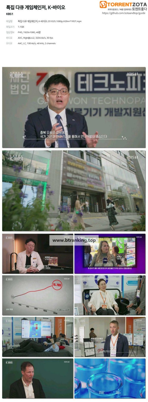 특집 다큐 게임체인저, K-바이오.251025.1080p-F1RST 작성자 정보 admin 작성 작성일 2025.10.25 22:00 컨텐츠 정보 5 조회 목록 관련 링크 magnet:?xt=urn:btih:9814bd0b9ee97b713813d1721502c09bd3f72643 1 회 연결 첨부파일 특집 다큐 게임체인저, K-바이오.251025.1080p-F1RST.torrent 파일크기 토렌트 다운로드 등록일 2025.10.25 22:00 본문 특집 다큐 게임체인저, K-바이오.251025.1080p-F1RST 관련자료 이전 특파원 보고 세계는 지금.E424.251025.1080p-F1RST 작성일 2025.10.25 23:00 다음 동네 한 바퀴.E342.251025.1080p-F1RST 작성일 2025.10.25 21:00 댓글 0 등록된 댓글이 없습니다. 로그인한 회원만 댓글 등록이 가능합니다. 목록